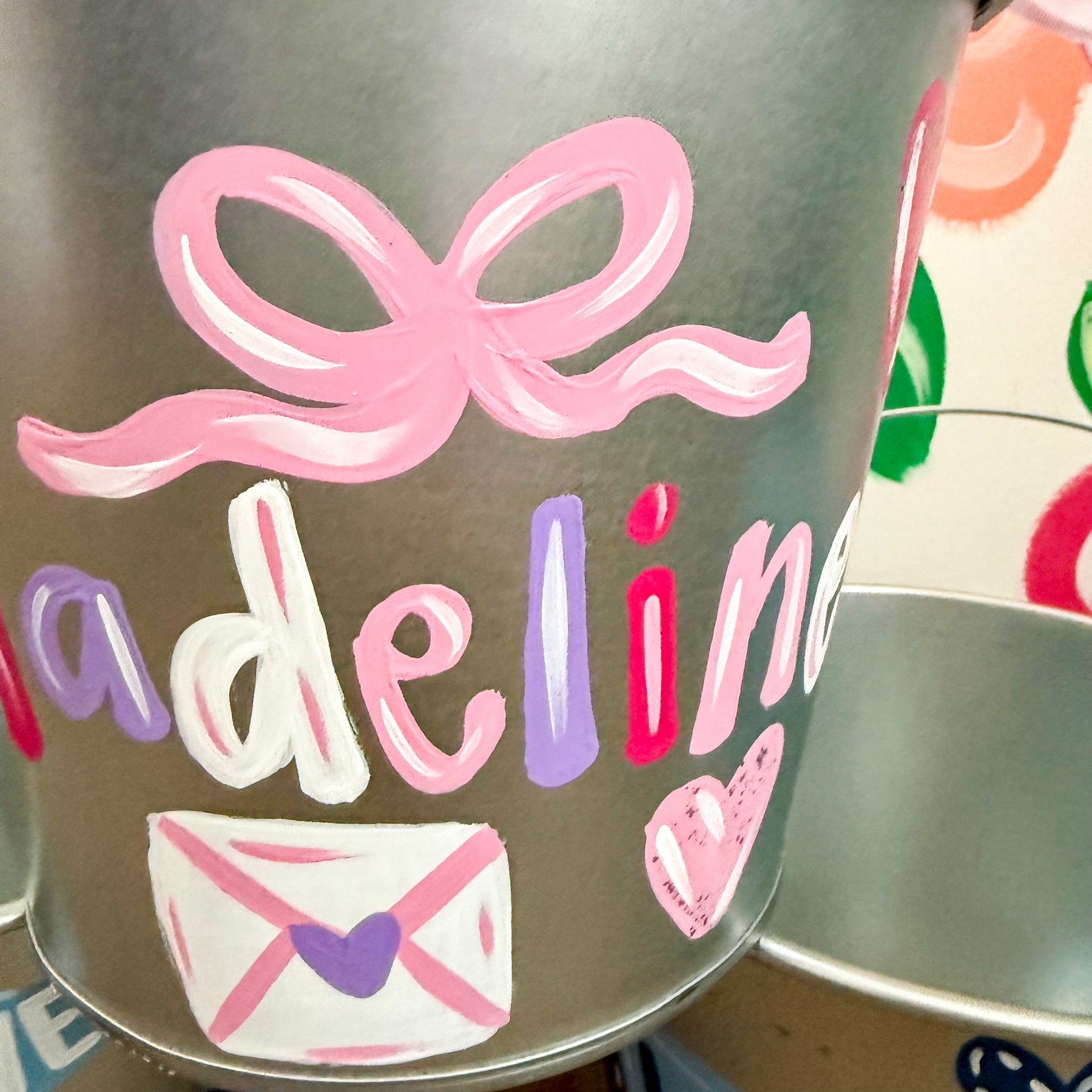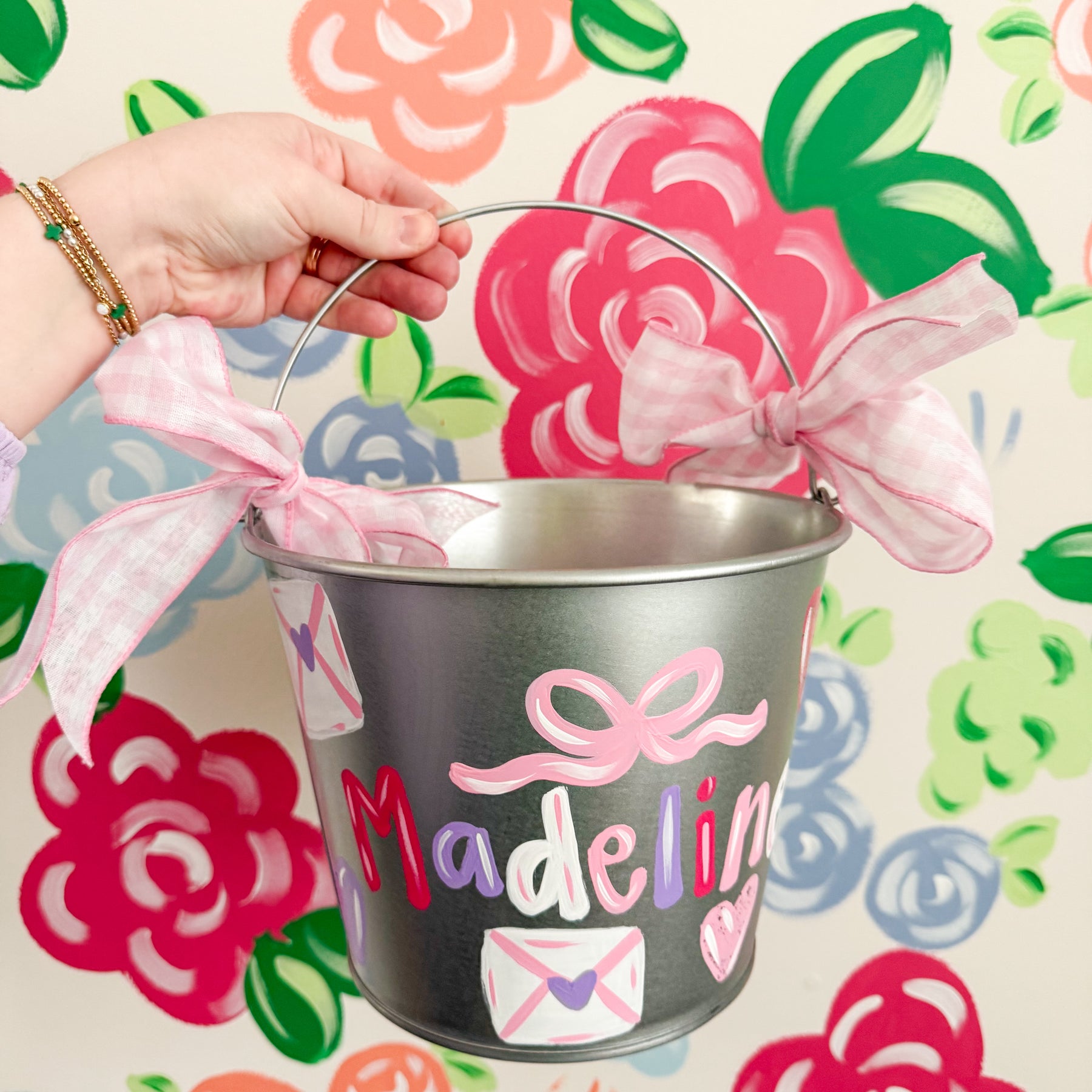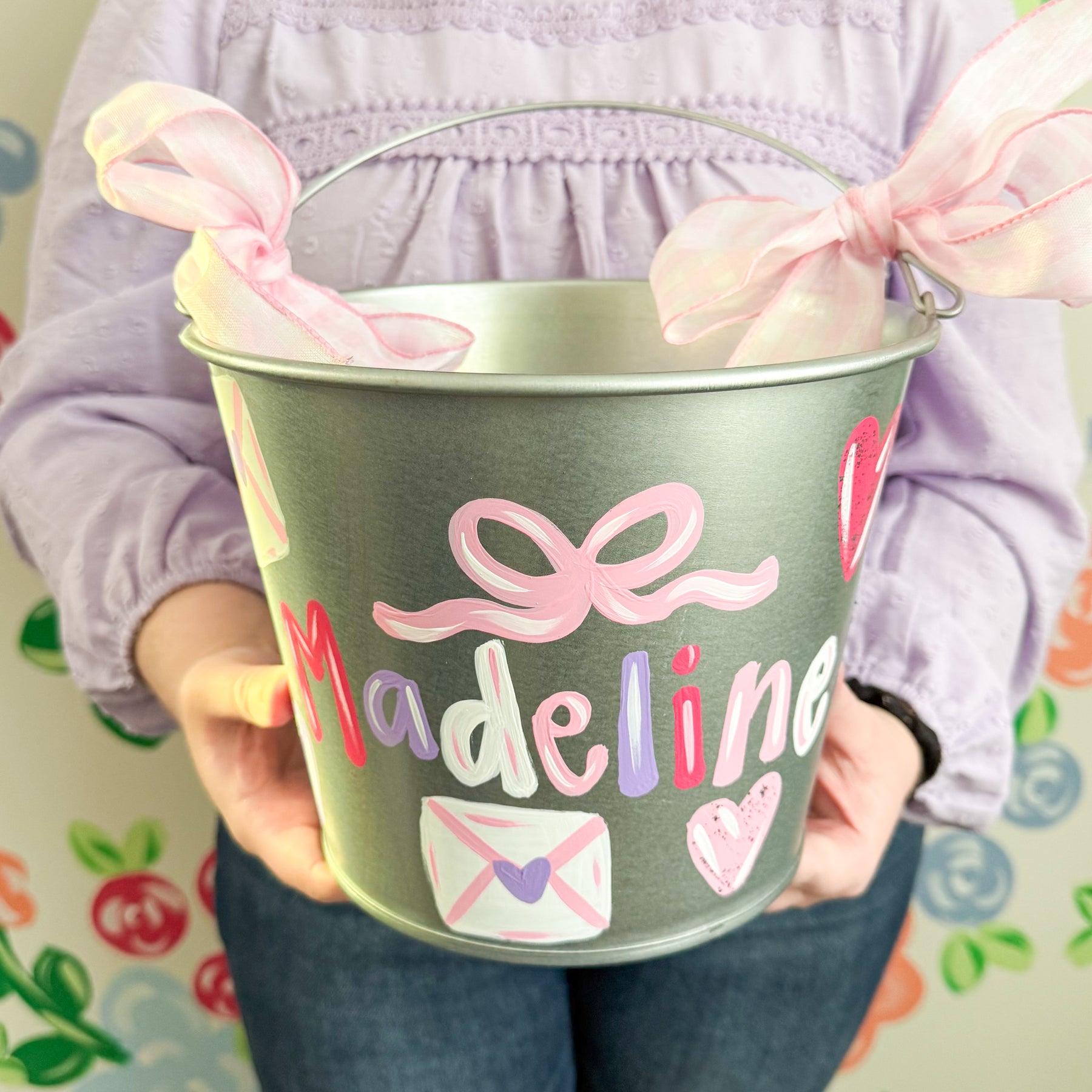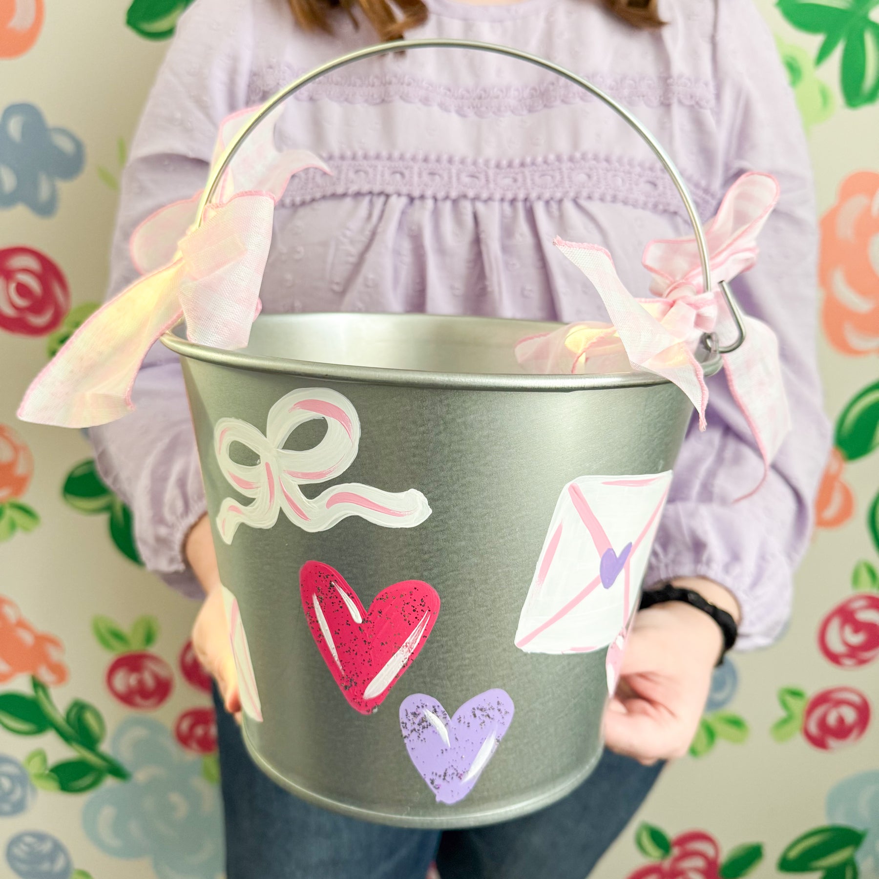 This adorable hand painted, boutique style Valentine bucket is perfect for all your Valentine activities!