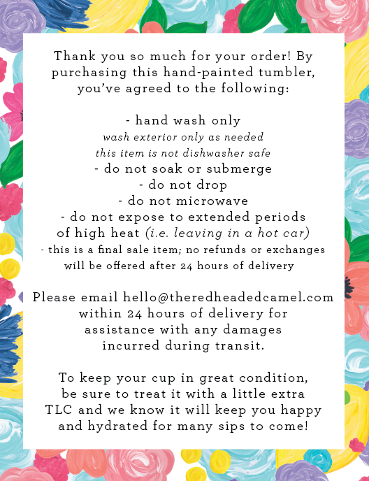 Note: As with any item you use, wear and tear is normal. The Redheaded Camel cannot be held responsible for damage to artwork once product is received and used. If you take good care of your cup, the artwork will last for a long time!