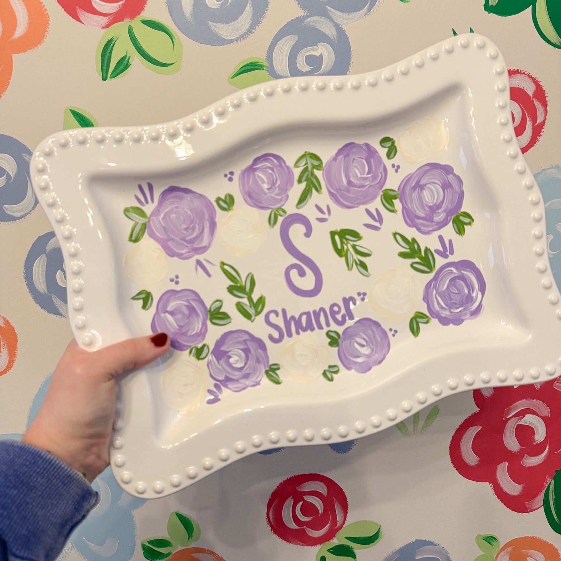 Our all-season hand-painted floral platters are designed to be both beautiful and meaningful—made to gather around for everyday moments and special celebrations alike. Each platter features Sarah’s signature floral artwork, thoughtfully painted by hand and personalized with your monogram and last name for a truly custom keepsake.