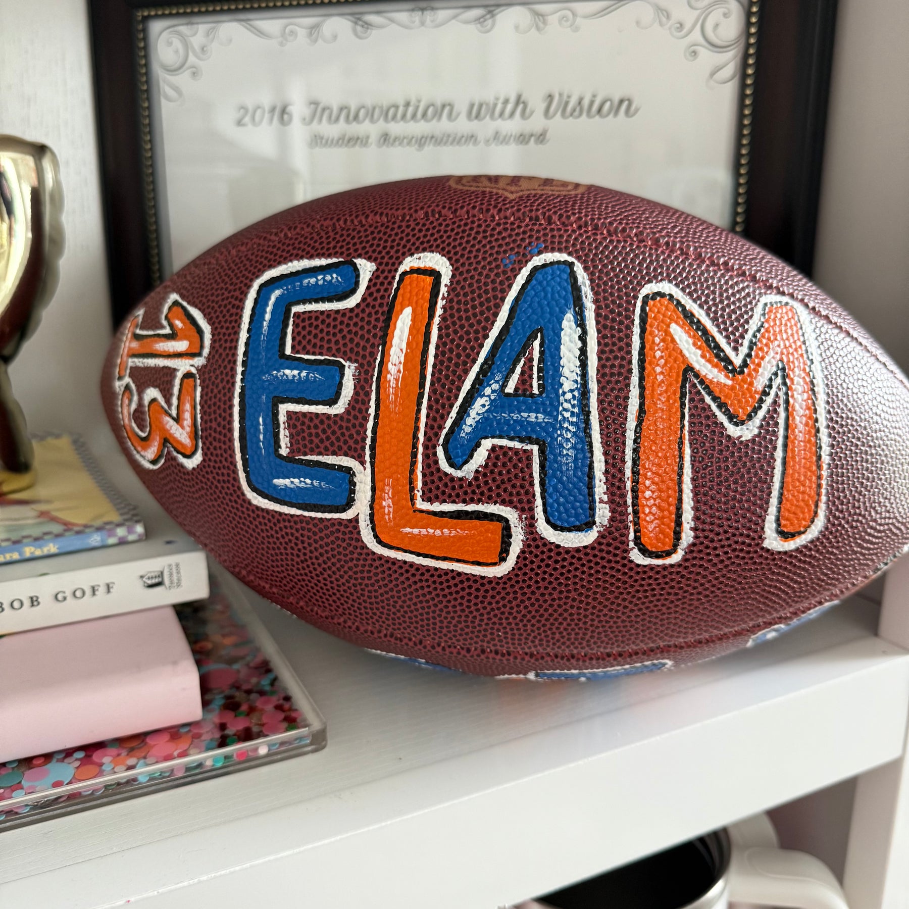 These are hand painted, free hand artwork painted onto your choice of sports ball. Features your choice of text, like player name, team name, a favorite Bible verse, year, and more.