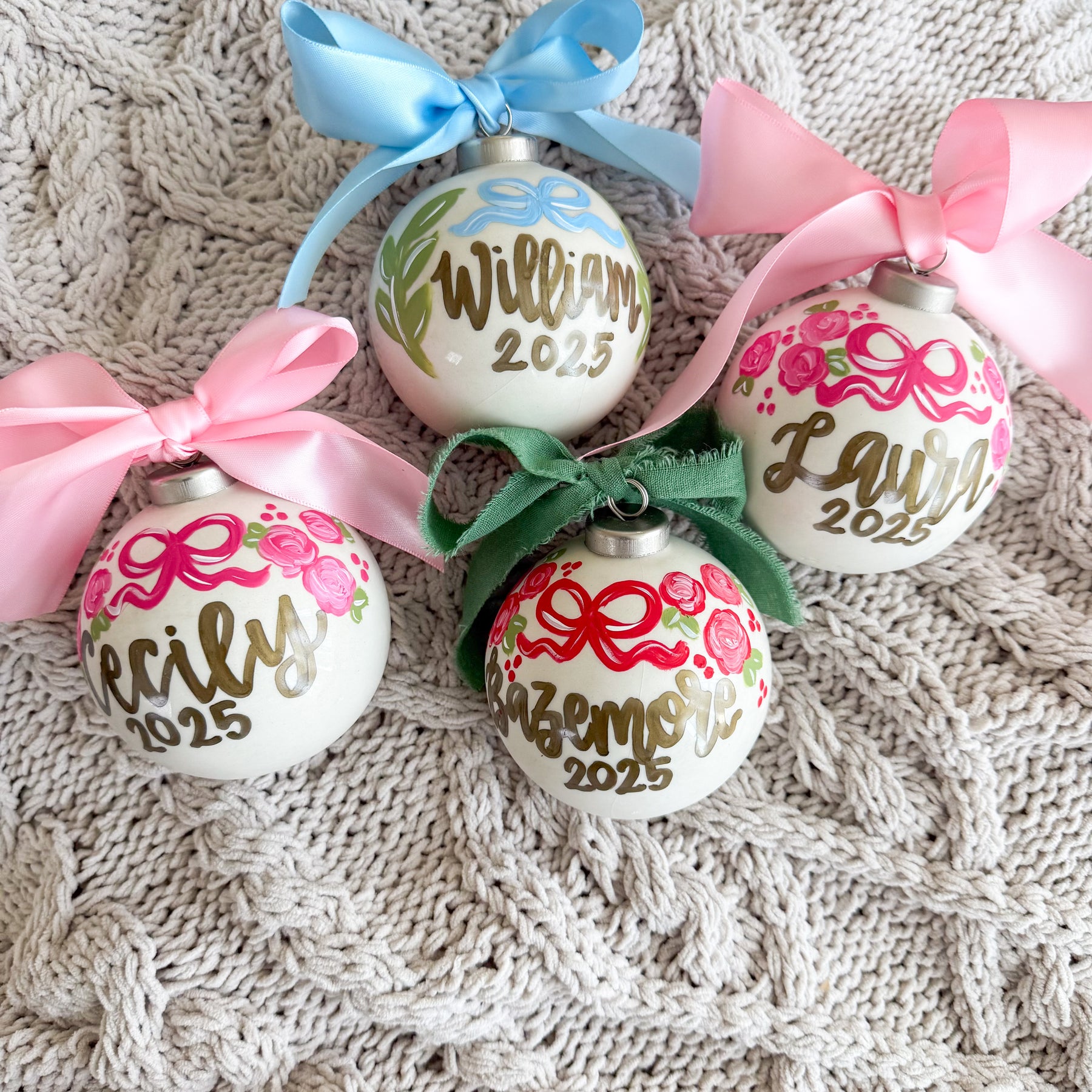 Our stunning new hand painted porcelain ornaments make a beautiful gift or keepsake for the holiday season! Painted with a red bow, classic red florals and greenery, and personalized with the name of your choice. Comes with a beautiful coordinating ribbon for a stunning heirloom piece.