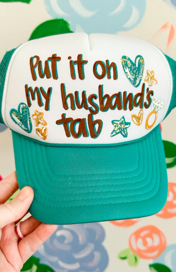 Our hand painted Put it On My Husband's Tab hat is the perfect accessory this season! Hand painted and so cute for casual days running errands, and beyond! Also makes a fabulous (and cheeky!) gift.